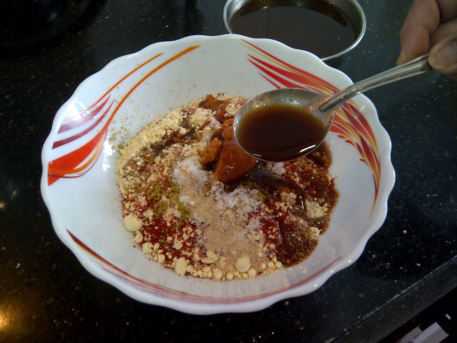 For the paste :1 cup Chickpea flour (Besan)1 & 1/2 tspn Red chilly powder2 tspns Coriander-Cumin powder1/2 tspn Asafoetida (Hing)2 tspns Jaggery (grated)6-7 tbspns Tamarind juiceWater as requiredSalt to taste